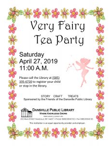 Friends of the Dansville Public Library present the Library’s annual Tea Party on April 27 at 11:00 a.m. Each child is invited to join us and to bring their own special guest. The Very Fairy Tea Party is open to children of all ages and their special guest. When you attend, you will be served a light lunch, beverages, and enjoy music, a craft and stories. There is room for more children to attend, so please stop by or call the Library to register at 585-335-6720.