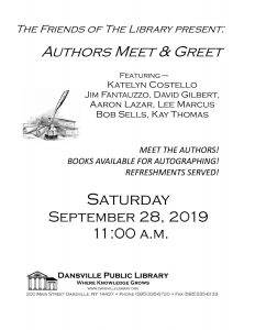 On Saturday, September 28 at 11 a.m. until 1 p.m., seven local authors will be on hand to talk about their books, writing, and to answer your questions. Authors are Katelyn Costello, Jim Fantauzzo, David Gilbert, Aaron Lazar, Lee Marcus, Bob Sells and Kay Thomas. Refreshments will be served. Books will be available for purchase and signing. For more information call the Library at 585-335-6720. This program is sponsored by The Friends of the Dansville Public Library. [NOTE: Though originally scheduled, author Gus Kenney will not be available for this event.]