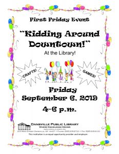 Join us at the library for this family friendly community event on Friday, September 6, 2019 from 4-6 p.m. There will be crafts and games. Don’t miss this special event offering a wide array of fun activities and opportunities for the community!