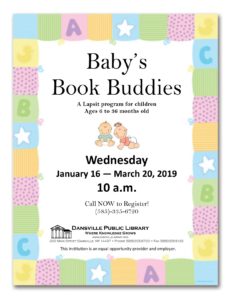 Ms. Mary Ellen presents the Winter session of Baby’s Book Buddies held every Wednesday at 10 a.m. This early literacy program for those ages 6 months to 3 years old instills a love of reading in your child that will help prepare him or her for success in school. Your Baby will learn new words, songs and fingerplays, and there is even space for a “play” session with new friends. Ms. Mary Ellen wants to know your child is coming so please call the Library at 585-335-6720 to register. All the books Ms. Mary Ellen reads in Baby’s Book Buddies also qualify for our 1000 Books Before Kindergarten program! You can sign up for 1000 Books when your child attends Baby’s Book Buddies. The theme for Jan 16 is “Hello”.