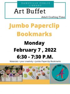 | Join Ms. Mary Ellen at the library for “Art Buffet.” Every first Monday at 6:30-7:30 PM, Ms. Mary Ellen will have adult crafting time! Ms. Mary Ellen will have a plan, supplies and materials. You bring your creativity! This month we will be working on Jumbo Paperclips Bookmarks. Have questions call the library at 335-6720.