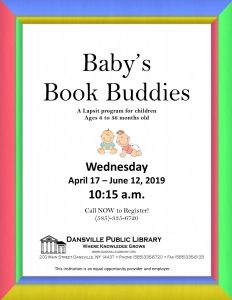 Lapsit storytime starts today! Baby’s Book Buddies begins this spring with Ms. Mary Ellen introducing children ages 6 to 36 months to the joy of books, fingerplays and songs! Please call (585)335-6720 to register your child or stop in the library.