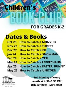| New at the library! Children’s Book Club, every 4th monday of the month from October- May! This book club is for children in kindergarten to second grade and will meet from 4:30-5:30 pm. Ms. Mary Ellen will be leading a book club with the popular series of How to catch…… by Adam Wallace. Book club will included reading the book together, hands-on activities and a snack. Monsters, turkey, elf, snowman, leprechaun and Easter Bunny will the trap you build be able to catch them! |