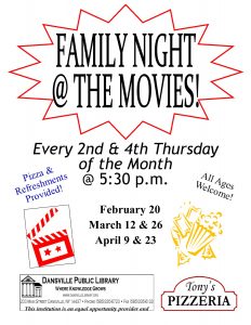 Families can enjoy a movie night at the library! We will show a different children’s movie at 5:30 p.m. every 2nd and 4th Thursday of each month beginning in February and ending in April. Pizza and refreshments will also be provided. The last movie night will be on Tuesday, April 23 at 5:30 p.m. The event is sponsored by Tony’s Pizzeria and Friends of the Library. For more information call 335-6720 or stop in the library.