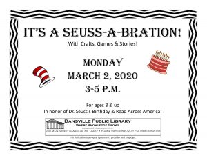 Join us for a Seuss-A-Bration on Monday, March 2, 2020 from 3-5 p.m. We will celebrate Dr. Seuss’s Birthday and NEA’s Read Across America Day, a nationwide reading celebration that takes place annually on March 2, Dr. Seuss’s birthday. Children can enjoy crafts, games and stories! Don’t miss this special event! For more information call the library at 335-6720.