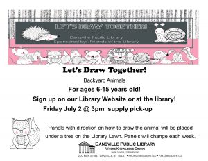 This program is set up for you and your child to visit the drawing panel each week. For your child to learn to draw , write and read about backyard animal of the week. The animal panel will be changed every monday from July to Aug. Supply Pick-up is Friday 2 @ 3pm on the Library Lawn