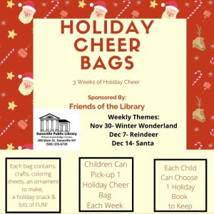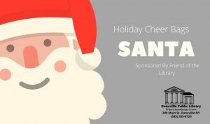 We are spreading Holiday Cheer to all the Kids! Come to the library and enjoy a Holiday Cheer Bag. Each Holiday Cheer Bag is filled with lots of fun! Each bag has an ornament (to made), crafts, snack and coloring sheets. This weeks theme is Santa.