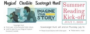 Join us on July 7 for a Summer Reading Kick-Off! Participate any time of day, on the Library lawn, for our Magical Creature Scavenger Hunt! Signs will show where to find your own Magical Creature Scorecard Bookmark and when and where to begin your search. Magical Creature Scavenger Hunt will be out until July 16. Remember social distance and wear a mask as you participate.