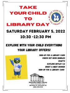 Calendar View Children's Calendar « All Events This event has passed. Take Your Child To Library Day 2022 February 5, 2022 @ 10:30 am - 12:30 pm EST « Busy Bee Storytime Winter Session Teen Art Time Wild Thing Bookmarks » Add to calendar Google Calendar iCalendar Outlook 365 Outlook Live Details Date: February 5, 2022 Time: 10:30 am - 12:30 pm EST