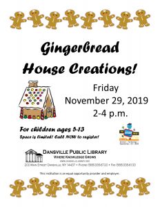 On Friday November 29 at 2 p.m., children ages 5 and up are invited to create a Gingerbread House. Families are reminded that this activity can be messy, so tie back long hair, wear clothes that can withstand an application of frosting, and get ready to have fun! We do have to limit the number of children who can participate, so please call the Library at 585-335-6720 to register your child. Then prepare to create and have fun!