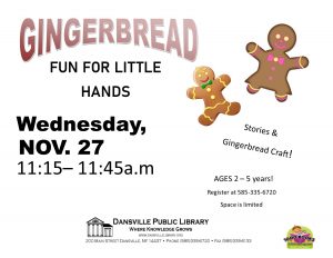 On Wednesday November 27 at 11:15 a.m. little ones ages 2 to 5 years old are invited to join Ms Mary Ellen making things with Gingerbread. Children will enjoy stories and treats while creating small craft items to take home. Please call the Library at 585-335-6720 to register or just stop in at the Library. Books read at this event qualify for the 1000 Books Before Kindergarten program — sign up today!